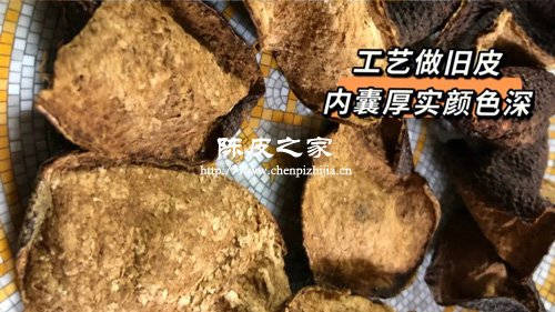是把没有完全晒干的橘子皮放在较高温度的地方,密封不透气的环境中,加速陈皮的发酵速度,这种陈化方式会使陈皮颜色变深的很快,几年的陈皮颜色会像十几年的颜色。