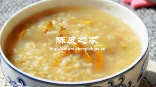 或以陈皮为原料,研磨为粉末,每次3-5 g,加水煮粥。每天1次,连续服用3-5天,具有和胃调气、化痰止咳的作用。常吃陈皮,可以去湿,有益于脾胃。用陈皮做粥,通常先用清水泡30多分钟,再用刀子把它削细或碎,或者捣碎,加入适量的清水、大米等食材,用大火慢炖,直至大米完全熟了,就可以吃了。