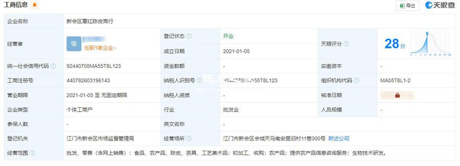 通查询了解到,小红家陈皮全名叫作“新会区章红记陈皮商行”,在天眼查可查询到其公司注册信息: